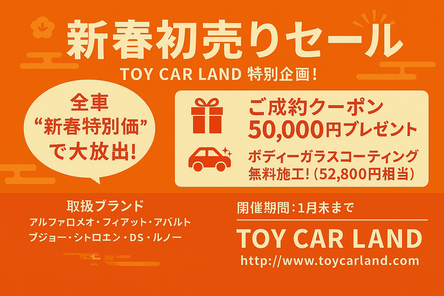 新春セール開催中!お得なご購入サポートクーポン付き!さらに、ボディーコーティング無料でピッカピカでご納車!詳しくはお問合せ下さい。
