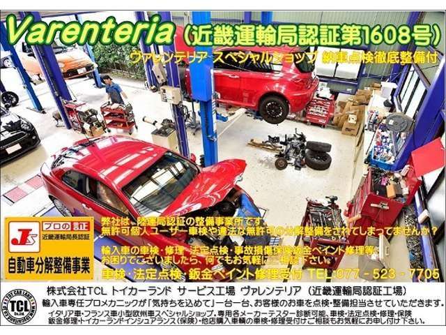 点検整備付き フィアットの整備はトイカーランド サービス工場ヴァレンテリア(近畿運輸局認証第1608号)にお任せ下さい。車検、修理、保険鈑金塗装修理、代車提供 台数多く入庫いただいております。(全予約制:077-523-7523)
